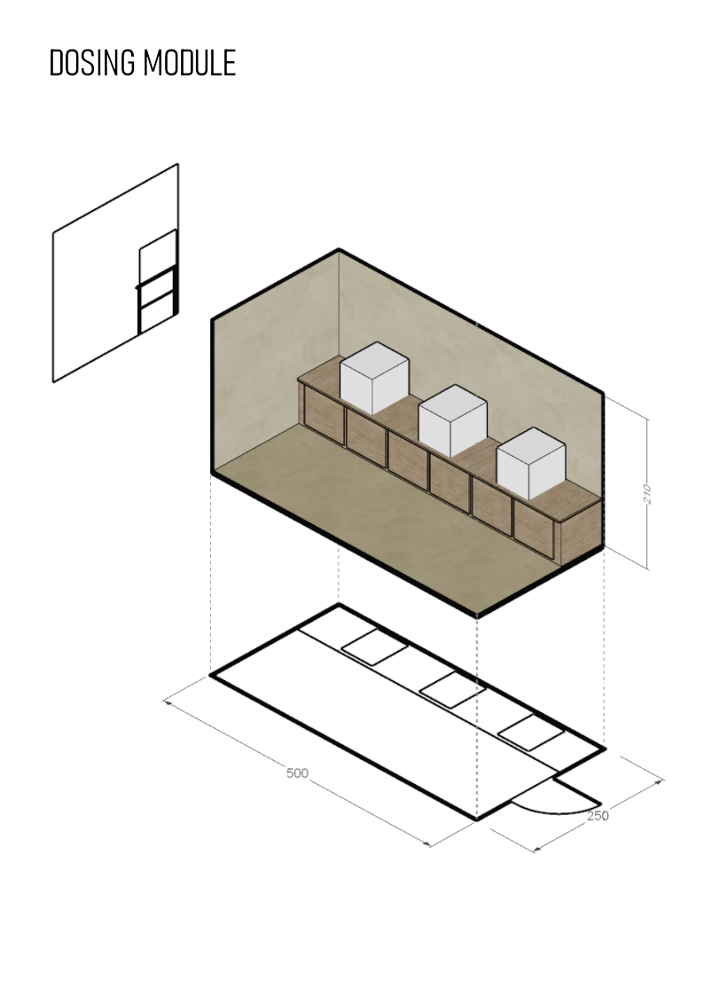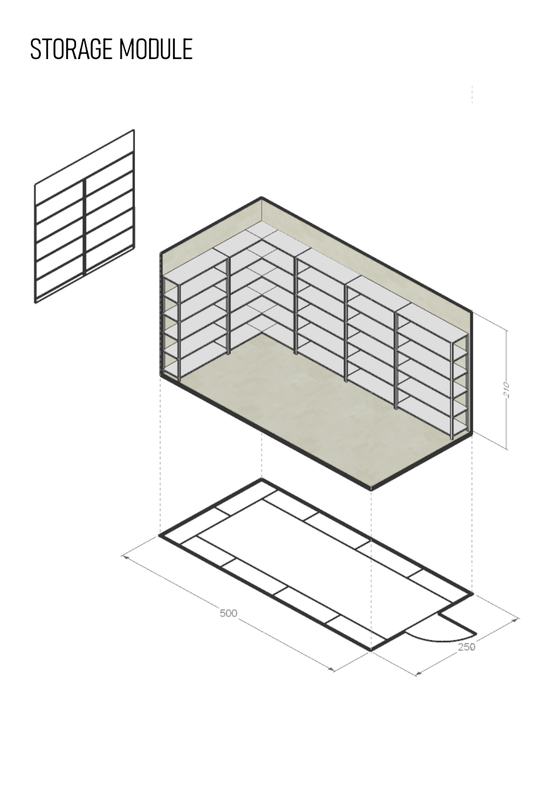 In the case of this urban farm, storage is required to store seeds, growing substrates, tools, cleaningand maintenance equipment, fish food, etc.