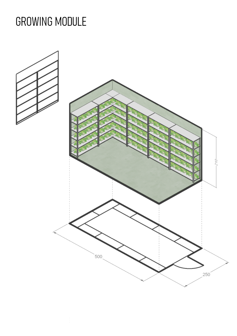 It is anticipated that the size of the module should be ten percent of the overall footprint of the urban farm, with a minimum size of one car parking bay.